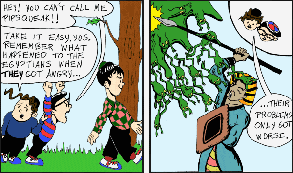 "There was one [giant] frog. The Egyptians hit it and it split into swarms and swarms [of smaller frogs]." (Rashi Sh'mos 8:2)